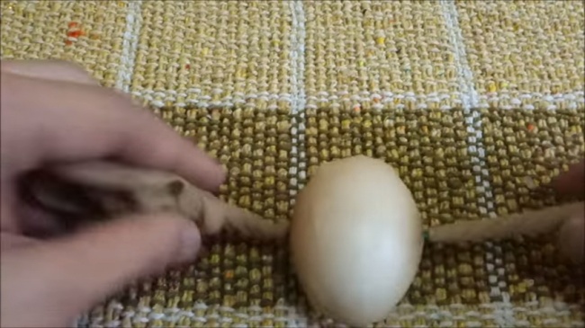 Возьмем чулок и примерно в середину его поместим яйцо, которое потом с двух сторон хорошенько завяжем.