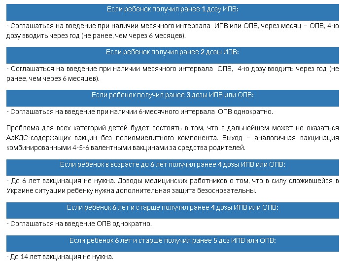 - 6 лет - "Инфанрикс ИПВ" или "Бустрикс"+ОПВ, а также "Приорикс" или "Тримовакс"