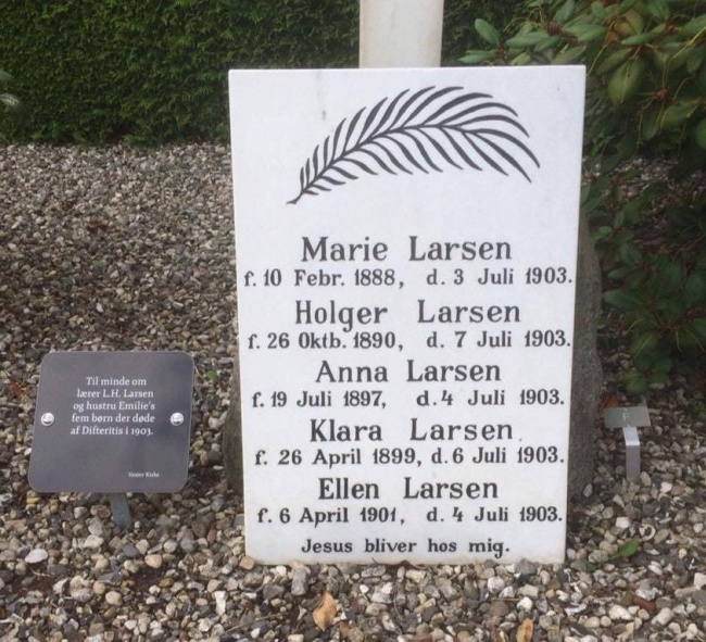 Напис зліва: «В пам'ять про 5 дітей Л. Х. Ларсена і його дружини Емілії, які померли від дифтерії в 1903 році».