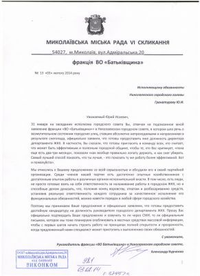 Временно исполняющему обязанности Николаевского городского головы Гранатурову Ю.И. руководителя фракции «ВО «Батьківщина» в Николаевском городском совете Курченко А.Т. Уважаемый Юрий Исаевич, 31 января на заседании исполкома городского совета Вы, отвечая на подписанное мной заявление фракции «ВО «Батьківщина»» в Николаевском городском совете, в котором шла речь о возмутительном состоянии городских улиц, ставших абсолютно непроходимыми и непроезжими в результате снегопада, официально заявили, что готовы предоставить мне должность директора департамента ЖКХ. В частности, Вы сказали, что готовы пригласить в команду всех, кто считает, что может быть эффективным и полезным городской общине, чтобы те, кто Вас критикует, «пoкa eщe ecть двa-тpи мecяцa», показали «кaк вooбщe пpaвильнo лoпaтy дepжaть, и кaк cнeг yбиpaть. Caмый лyчший cпocoб пoкaзaть, чтo ты лyчшe, - этo пoкaзaть тy жe paбoтy бoлee эффeктивнoй. Boт и пoжaлyйcтa». Мы отнеслись к Вашему предложению со всей серьезностью и обсудили его в своей партийной организации. Среди членов нашей партии есть достаточно опытных хозяйственников с достаточным опытом работы в различных органах исполнительной власти. В том числе, есть люди, не просто готовые взять на себя ответственность за налаживание работы в городском ЖКХ, но и способные делом доказать, что, положив конец воровству, откатам и разбазариванию средств, установив реальную ответственность каждого сотрудника за качественное исполнение его функциональных обязанностей, можно навести порядок в любой сфере городского хозяйства. Поэтому мы принимаем Ваше предложение и официально заявляем, что готовы предоставить достойную кандидатуру на должность руководителя городского департамента ЖКХ. Прошу Вас официально подтвердить Ваше предложение и озвучить то ли через СМИ, то ли официальным письмом, которое мы тоже планируем опубликовать в местных средствах массовой информации, чтобы с первых шагов начать строить работу на принципах полной открытости и прозрачности, когда предложенный нами специалист может приступить к выполнению своих обязанностей. С уважением, Руководитель фракции «ВО Батьківщина» в Николаевском городском совете, Александр Курченко