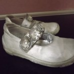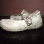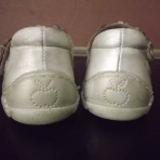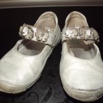 Серебристые туфельки 23 размера, носочки сбиты. Для двора или сада. Нет двух цветочков с внутренней стороны.