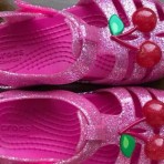 Верх очень эластичный (желейный), мягкий - по сравнению с другими моделями Crocs. Украшены спелой вишенкой. Подошва антискользящая.