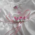 Пышное, нарядное платье, белое, с нежнорозовыми цветочками на поясе и юбке. Сзади на змейке.