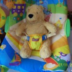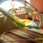 Кресло переносное с режимом вибрации и съёмными дугами, на которые крепятся игрушки: крабик со звуковыми и световыми эффектами, бегемотик-погремушка и прорезыватели для зубок.