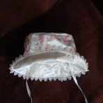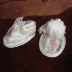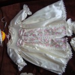 Набор шился на заказ. Материал - парча. Вышивка машинная, очень нежная. Платьице нашито на комбинезон, внутри ситцевая подкладка. Сзади завязывается на шнурочки. Тапочки на резиночке, панамка на шнуро...