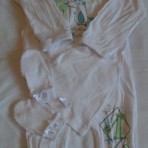 Костюмчик белого цвета "Лисенок"! Ткань мягкая, для тела очень приятна! В комплект входит - ползунки, кофточка, шапочка и защита на ручки)