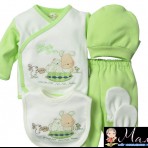 Прекрасный комплект на выписку или же для подарка. В комплект входят: шапочка, ползунки, слюнявчик, кофточка, царапки.