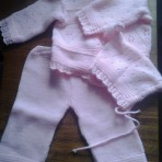 красивый мягенький костюмчик на девочку машинной вязки. ни разу не одели т.к. переросли. длинна штанишек-32 шаг-19 кофточка по спинке-25 рукав от плеча-20