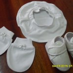 Одет один раз для фотосессии.Размер от 0-3 месяцев.Производства -Турция,100% хлопок с атласным декором.Очень красивый.В упаковке.В набор входит :штанишки,кофточка,берет,царапки и пинетки.