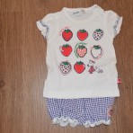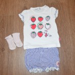 Состояние идеальное.Турция.Качество - отличное,ткань легкая,посадка шортиков на памперс очень хорошая.Футболочка на кнопочках,возраст указан 3-6 мес.,думаю-можно с 2 мес.Хорошенькие носочки в подарок!...