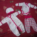 Комплект детский, 4 вещи (интерлок). В комплект входит:человечек, бодик, ползунки, шапочка. Размеры: 56 и 62см. В наличии разные расцветки.