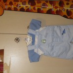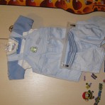 Бодик - голубого, с воротничком, сделан под тенниску. Полукомбинезон голубой хлопковый, застегивается на шлейках, по бокам по две пуговицы. Между ножек - заклепки под памперс. Украшен очень красивой вышивкой-аппликацией динозаврики. Отличное качество. Красивая модель.