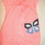Фото 4-5 - песочник в ярко-розовую полосочку на кнопках с вышивкой бабочки. Резиночки на ножках отлично смотрятся на худеньких ножках новорожденных деток. Ребёнок не выглядит как в мешке! На рост 55 см. Состав 55% хлопок, 45% полиэстр (из-за неонового розового цвета). Цена 50 грн.