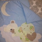 100% хлопок . наполнитель - силиконизированное волокно. аппликация в виде спящего мишки. Одеяло размером 120 на 90см. подушка полукруглая с ушками размером 35 см на 32.