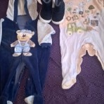 Все вещи в хорошем состоянии после нашего сыночка. Вещички модные, качественные, на ребенке смотрятся очень круто. В пакет входят такие вещи : халатик Супер Бейби, брюки, штанишки, теплая кофта с капюшоном (носили осенью как куртку), 2 боди-рубашки, 3 бодика с веселыми надписями, синий теплый костюм-двойка, человечек с надписями, человечек-мишка с капюшоном с ушками, теплые угги.