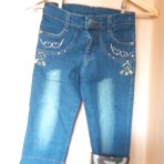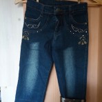 Отличные эффектные синие бриджи на девочку 10- 12 лет с вышивкой стразами . Декоративные манжеты хаки .