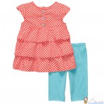 фото 7: летний комплект состоящий из леггинсов голубого цвета и туники красного цвета в белый горох. Туника сзади на кнопках. Спереди стилизована пуговицами под цвет легинсов.