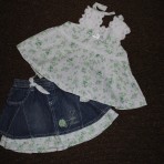 2.Комплект джинсовая юбка+ топ розлетайка.Можна сказать что новые,только бирки потерялисьпереросли мы его.12М по бирке.Замеры: ширина юбки 21см,длина 23см.Топ ПОГ 27см,длина 32см. 100грн