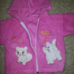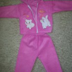 Детский розовый спортивный костюмчик на молнии с кошечками. Длина рукава от плеча 20 см. Длина кофточки 31 см. Длина штанишек 41 см