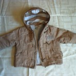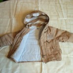 Капюшон, кармашки, на змейке и застежках. С вышивкой на груди и шеврончиком на рукаве. Цвет свело-коричневый.