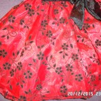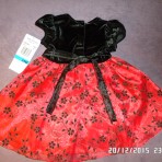 Новое, красивое праздничное платье для маленькой принцессы. Короткий рукав с воланом, верх - черный стрейч-бархат. Юбка трехслойная с подъюбником. Верх алая органза с набивным рисунком. Впереди на поясе бант. В комплекте трусики.