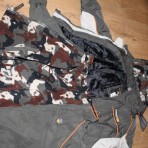 Замечательные две курточки! Одна двухсторонняя (без капюшона на резинке внизу) -флис камуфляжного цвета и типа плащевки цвет хаки. Рукавчики на резиночке. Вторая (с капюшоном, внизу ровная без резинк...