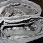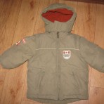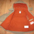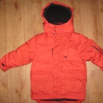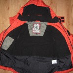 Верхняя ткань не продувается и не промокает, подкладка флисовая, наполнитель пух и перо. Состояние хорошее, дефект один, видно на последнем...