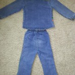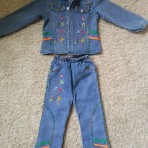 КУРТОЧКА С КАРМАНЧИКАМИ ОБМАНКАМИ, СПЕРЕДИ ВІШИТІ БУКВЫ И ЦВЕТОЧКИ. Застегивается на 4-х пуговичках. В конце рукава манжетик, который тоже застегивается на пуговичке.Длина рукава от плеча - 36 см.Длина курточки от плеча - 36 см. Объем груди - 64 см. Джинсы на резиночке. Спереди карманчики обманчики и вышиты буквы и узоры. Длина штанины от пояса 60см. Внутренний шов - 38 см.