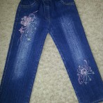 Джинсы почти новые, одевали пару раз.Спереди на штанинах розово-серебрянные рисунки. Есть карманчики, только нужно вытянуть ниточку. Сзади тоже есть 2 карманчика на которых тоже рисунки. Пояс на резиночке. Длина штанины от пояса 59 см, внутренний шов - 42 см.