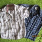 Рубашки на 4-6 лет, синяя на рост 116, обхват груди 59 см, ворот 35 см, длина - 46 см,светлая - рост 110 см, ворот - 35 см, обхват груди 56 см, длина - 47 см.