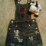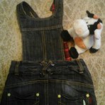 Выглядит очень эффектно.Без изъянов. Рисунок-вышивка.Впереди и сзади по 2 кармана.Пояс застегивается на пуговицы.Лямки с 2-мя пуговицами (позволяет варьировать в размере).