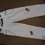 Чёрно-белое платье 150. Кофейное платье-туника 75. Шорты джинсовые 50, с бабочками 75. Брюки серые и джинсы синие по 100г. Голубые джинсы с гипюром 130.