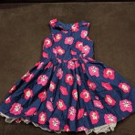 Платье сине-пудровое 300. Розовое с цветами 120. Чёрное с цветами 50. Синее с цветами, белое с леопардовыми пятнами, 150. Чёрное платье-туника, сарафан в горошек 80. Юбка розова в белый горошек 25. Юбка синяя в горошек и розовая по 75. Джинсы 100. Джинсы с жемчугом и стразами 175 (новые).