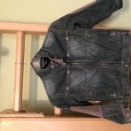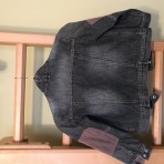 Джинсовая куртка( унисекс) на флисе. Рост 100-105см. Синяя с коричневыми котоновыми нашивками на локтях. Рукав-37; длина-40; ширина-35; плечи-31см.