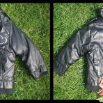 Куртка демис. 80грн до 2,5,похоже на дермонтин +синтепоне. Сердечко из блестящих камешков, карманы. на плечах погоны (длина 37см/ рукав29см)