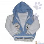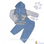 Набор из тонкой, легкой махры. Состоит из трех предметов: штаны, кофта и жилетка. Жилетка на молнии с капюшоном. Вышивка котик и собачка размещены на жилетке. Удобный и теплый костюмчик для Вашего малыша.