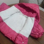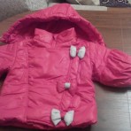 Теплая курточка на малышку на синтепоне. Размер 80, длина изделия -36см, рукав-25см, ширина спинки-29см. Пр-во Турция. Подкладка- махра, манжеты на резинке, съемный капюшон. Очень легкая.