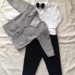 Трикотажный костюм состоит из кофты со съемной бабочкой, пиджака на флисе и штанов на резинке. Комплект очень удобный, не сковывает движения.