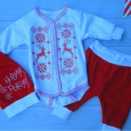 Новогодний комплект "Первое Рождество" выполнен из качественного трикотажного полотна Футер, очень теплое и приятное на ощупь, хорошо держит цвет и не садится после стирки. Комплект состоит из кофточки с вышивкой на новогоднюю тематику, штанишек на манжетах и чудесной шапочки. Такой комплект непременно подарит праздничное настроение Вам и Вашему малышу!