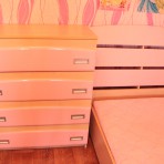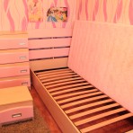 Продаю спальный гарнитур для девочки. Кровать с ортопедическим матрасом, комод на четыре ящика, очень вместительный, и тумбочка. Основа молочного цвета с розовой отделкой.