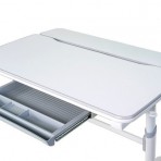 Благодаря регулировке высоты в широком диапазоне 58-80см, он прослужит до конца школы, а благодаря качественным материалам, останется еще и внукам. Новый механизм позволит без усилий изменять высоту. Для плавной регулировки надо лишь повернуть специальную ручку. Несмотря на то что столешница белого цвета, антибликовое покрытие сбережет глаза ребенка от отражения бокового света. Evo- 501 обладает возможностью регулировки угла наклона столешницы от 0 до 25 градусов и может комплектоваться противососкальзывающей резиновой накладкой. Такая накладка служит так называемым барьером для книг, не позволяющим им падать, при регулировке угла наклона.