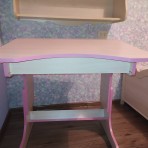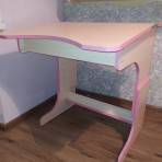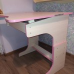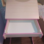Столешница под наклоном. Под столешницей ящик для принадлежностей и поднимаются подпорки для того, чтоб стол стал ровным.