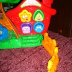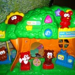 В наборе – фигурки животных, предметы для ролевой игры, геометрический сортер, дополнительные фигуры. Яркие сенсоры на игрушке помогут угадать, где находится конкретное животное или фигура. На кроне дерева расположены кнопочки, при нажатии на которые ребенок узнает названия предметов, изображенных на этих кнопках, прослушает считалки, получая сведения об азах счета. Из-за дерева выглядывает светящееся солнышко, само же дерево поет песенки.
