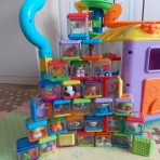 Более подробно Вы можете узнать о возможностях игрушки, посмотрев больше фото и видеоролики. Можно вставлять кубики в специальные "тоннели", сопровождая все звуковыми эффектами, а потом нажав на рычаг кубики выбрасываются наружу с веселым звуком; можно забрасывать кубики в отверстия и наблюдать как они будут забавно скатываться сквозь разноцветные штыри, можно смотреться в безопасное зеркальце!