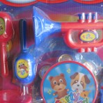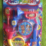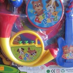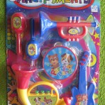 целый набор музыкальных инструментов(барабанчик-бубен, маракасы, дудка, гитара, труба).с этим набором Ваш малыш не только устроит Вам праздник но и научится звучанию различных музыкальных инструментов.