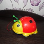 Жук машет крылышками, звенит когда едет. Его нужно тянуть за веревочку, батареек там нет.
