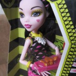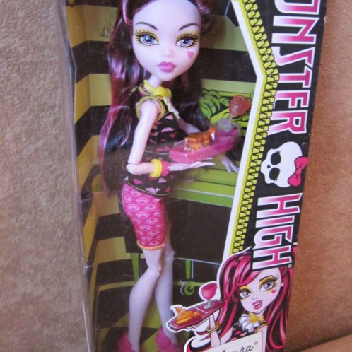Кукла Дракулаура Monster High фирмы Mattel. Простая коробка, без подставки. Куколка в юбке, кофте, обута, с браслетами на руке, ожерельем на шее, в руках поднос из кафе (с бокалом и пирожным).