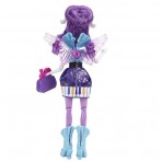 Твайлайт Спаркл примеряет на себя образ солистки рок-группы Rainbow Rocks , самой модной музыкальной группы во всей стране Эквестрии. В серии «Стильные прически» эта кукла вышла в совершенно новом формате. Образ Twilight Sparkle стал еще более фантастическим и впечатляющим! У Твайлайт очень красивая прическа — ее фиолетовые волосы собраны в пучок на затылке, вниз спускаются две завитые пряди, а на лоб спадает аккуратная прямая челка. Наряд Твайлайт заслуживает особенного внимания. На ней платье с голубым верхом и фиолетовой юбкой. Верх платья украшает большой стоячий воротник в складку, а на юбке можно увидеть изображения клавиш. Этот же сюжет повторяется и в декоре ее сережек, которые тоже выполнены в виде черно-белой клавиатуры пианино. На ножках куклы голубые ботинки, которые очень подходят по стилю к воротнику ее наряда. Ручки Твайлайт в высоких белых перчатках.
