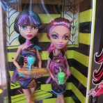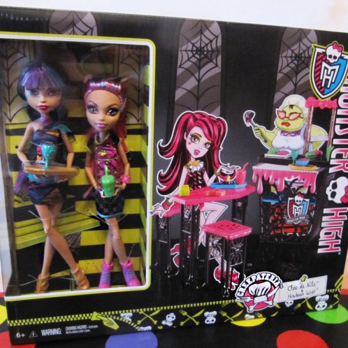 Большой набор Монстер Хай с двумя куколками и мебелью Monster High Creepteria с куклами Cleo de Nile и Howleen Wolf. Куколки в наборе шарнирные. У них прошиты волосы. Одеты в стильные платья и туфли. В руках - аксессуары (поднос с напитком и напиток). В набор входит барная стойка, стол, стулья и аксессуары для обслуживания посетителей кафе.