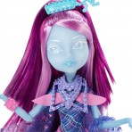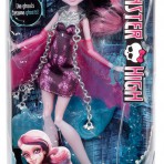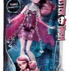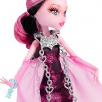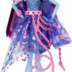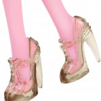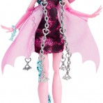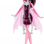 Мне кажется, в этой серии она в одном из самых мистичных и серьезных своих образов. У нее очень томный и деловой взгляд с загадкой. Широкая полоса, покрывающая глаза, нос и щеки выглядит как нежный перелив. Длинные, роскошные ресницы и очень женственный макияж в светло розовых тонах умиляет своей красотой. Тонкие, светло-коричневые брови делают лицо более лилейным. Под левым глазом небольшое сердечко серо-зеленого цвета с малиновым контуром. Губы цвета темной фуксии, на которых нарисованы белоснежные клыки. Сочетание мягкости и грубости. Школа Монстров разрушает буквально все стереотипы делая противостояния. Например, Дракулора – монстр, но мы привыкли видеть монстров страшными уродами, чего не скажешь по куклах Монстер Хай. Они все очень красивые и привлекательные. Сильно привлекает внимание волосы Дракулолы: они очень дивно раскрашены розовым и черным цветами, широкими пробелами. Дракулаура Haunted Getting Ghostly одета в короткое розово-черное платье с принтом паутины. В верхней части тела оно более обтягивает тело куколки, в нижней части – юбочка пышная. На руках нежные светло-розовые перчатки, которые создают впечатление крыльев. На шее серебряное ожерелье, которое свисает двумя цепями почти до колен.